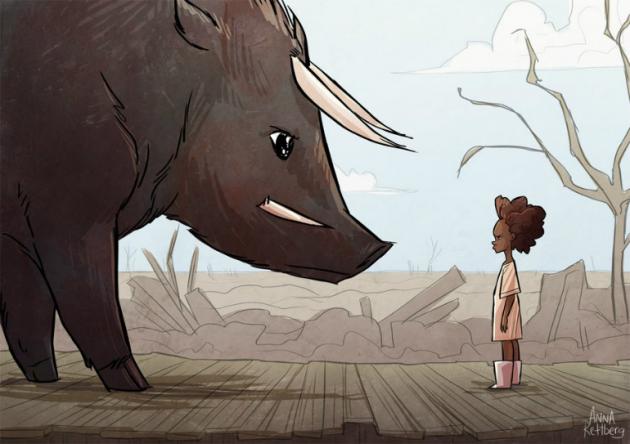 La cinta me recordó El Laberinto del Fauno: una pequeña niña se presenta como puente entre dos mundos, el real y el fantástico. Hushpuppy es una niña extremadamente inteligente que hace interpretaciones complejas a partir de datos simples de la realidad. Tiene el ojo del escritor que asocia todo lo que ve como parte de una trama de una historia trascendente.Es muy recurrente en literatura aprovechar la “mirada extrañada” de un protagonista para observar de manera más rica una realidad simple o cruel.La vida es infinitamente más rica que la estrecha visión que separa a las personas en clases sociales: una niña que vive en un arrabal desastroso puede tener más imaginación que un niño que vive en un apartamento de clase media o en una mansión.No existe historia o cuento que no enfrente un protagonista con un conflicto que lo termina transformando. De hecho lo que hace el protagonista para vencer sus limitaciones u obtener lo que desea lo convierte en héroe de su historia personal.Si quieres contar una historia con influencia universal concéntrate en la particular vida de un personaje en convivencia con su entorno: en una gota de agua de mar se encuentran todas las características presentes en un océano.Las preguntas que se hace Hushpuppy son las mismas que se hace un ejecutivo en Nueva York o un autobusero en Lima: las preguntas eternas que laten en la conciencia del hombre son la llama de los cuentos y por eso llenamos las salas de cine y devoramos libros; queremos recobrar la experiencia de sentarnos alrededor de una fogata para escuchar al chaman contándonos leyendas. La madreDefinitivamente la figura materna marca el accionar de la protagonista de Beasts of the Southern Wild. Tal es así que en su mente la escucha cuando observa uno de sus vestidos y la opción de buscarla siempre está presente.Todo héroe de literatura busca conseguir un objeto mágico o rescatar una princesa: Hushpuppy mantiene en su destartalada casa los objetos de su madre y no se amilana en nadar en su búsqueda cuando ve destruido lo que considera su hogar.La madre de Hushpuppy encarna un arquetipo femenino dual: es la amazona pero también la Venus; es decir, es una guerrera y a su vez es la amante ideal. En este caso no se utilizó el arquetipo femenino de la madre o de la virgen: incluso cuando la trabajadora sexual acoge por momentos a Hushpuppy no lo hace para protegerla de forma maternal sino para prepararla para lo difícil de la vida, como un soldado que se enfrentará a una guerra. El padrePor su parte la figura paterna y masculina se muestra en en minusvalía con respecto a lo poderoso de la figura femenina, no sólo de la madre sino de la propia niña.Me parece sumamente curioso el hecho de que una niña tan pequeña tuviera su propia casa a parte de la de su padre. Todo parece funcionar de manera diferente en “La Tina” lo que permite que la frontera entre realidad y fantasía sea permeable.El padre es el vehículo por medio del cual Hushpuppy vence su temor a la muerte: ella cree que si rompe algo su universo colapsará, pero logra superarlo gracias a su padre que le prohíbe llorar si muere porque “cuando alguien parte, en otro lugar le dan la bienvenida”. La casaEl hogar es la cueva mítica donde atávicamente nos sentimos seguros y es un reflejo o metáfora del universo. Como uno de los temas que late por debajo del film es lo frágil del equilibrio de la naturaleza y lo intrincado de las relaciones entre sus componentes, la casa resulta ser un lugar simbólico sobre el cual se estructura la historia. A la protagonista le obsesiona la idea de ser responsable de la estabilidad del universo hasta tal punto que le pide perdón a su madre imaginaria por creer haber roto algo y esto haber producido la enfermedad de su padre. La casa es tan importante que de hecho la película inicia con una impactante imagen del hogar de Hushpuppy mostrando lo aterradoramente vulnerable que es.El UroTodo héroe requiere de un villano a vencer para que se conforme efectivamente la trama de la historia. En el caso de Beasts of the Southern Wild, la joven Hushpuppy tendrá que enfrentarse con un toro salvaje prehistórico.El Uro encarna los temores de la protagonista específicamente con respecto al tema de la muerte. La inocencia infantil de Hushpuppy hace que cree que sus acciones son las causantes del resquebrajamiento del orden natural del universo y que será castigada por ello. El animal funciona como una especie de Minotauro que se encuentra al acecho en el intrincado laberinto del mundo de la Tina.En la historia todo hace referencia al universo. La “chamana” del grupo llega a decir que todos –animales y humanos- son sólo “carne” que son engullidos por el universo. Esta relación tan estrecha entre animales y humanos refuerza la idea de lo interrelacionado que están los ecosistemas y el efecto negativo del accionar del hombre sobre el frágil equilibrio de la naturaleza.El título de la película nos da una pista sobre el enfoque que el autor le da a la relación animal-hombre. Cuando se ve cómo come Hushpuppy y su padre le dice que comparta el alimento con el perro, se observa como las distancias entre animales y humanos se acortan: todos somos carne.Hay una sutil religiosidad en la relación con los animales cuando al inicio del film la protagonista reflexiona sobre el lenguaje misterioso de los corazones.Pero esta sutileza se confronta con la brutalidad de la sobrevivencia: “Si mi padre no aparece me tendré que comer a mis mascotas”, piensa Hushpuppy preocupada por la ausencia de su progenitor.El film ataca la soberbia humana de creernos superiores a los animales. La protagonista lo deja muy claro: Si los Uros hubieran sobrevivido a la glaciación ella no sería Hushpuppy sino un desayuno.Por @Joaquin_Pereira