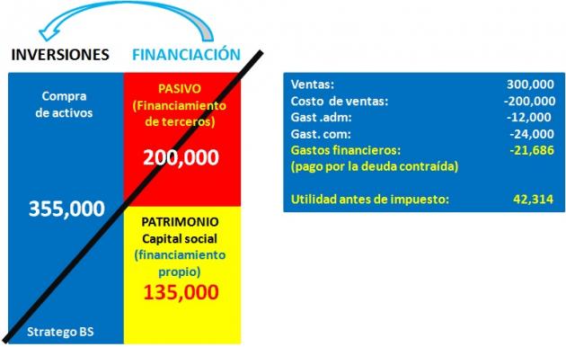 Para iniciar una empresa primero necesitamos adquirir maquinarias, equipos, mercadería, inmuebles, tener efectivo para poder afrontar cualquier eventualidad en el corto plazo, etc. según la empresa lo requiera, estas adquisiciones tienen un costo, por ejemplo una empresa de transportes necesitará comprar camiones, equipos de computo y tener efectivo para pagar al personal; esta primera inversión será por un monto total de 355M, los socios tienen dos alternativas: aportar con su propio pecunio la cantidad necesaria para adquirir los activos o sólo aportar un porcentaje y la diferencia financiarse de terceros (proveedores, bancos, etc.). La inversión se denomina ACTIVO y el cómo ha sido financiado esta inversión se denomina PASIVO, dentro del pasivo encontramos el patrimonio que está conformada por el aporte de los socios (capital social).Cuando un empresario decide invertir en activos por 355M sin deudas de terceros, necesariamente tendrá que aportar esa cantidad para mover esa inversión. En cambio si este empresario decide aportar 135M y la diferencia (200M) financiarlo por terceros (bancos, proveedores, etc.), se puede observar que el empresario aportando sólo 135M está moviendo una inversión de 355M, a esto se le denomina APALANCAMIENTO FINANCIERO (efecto palanca, representado en el gráfico por la línea negra en diagonal), porque el financiamiento de terceros le permite mover mayores inversiones en comparación con su propio aporte.Apalancamiento financiero es financiar parte de la inversión con deuda de terceros con el fin de mover una mayor inversión en comparación con el aporte propio (efecto palanca).Los efectos del apalancamiento son visibles en la rentabilidad. En el gráfico se puede observar que el resultado del ejercicio (utilidad) es de 42,314 (ingresos - gastos - gastos financieros). La fórmula generalmente utilizada para hallar la rentabilidad del negocio es: (UTILIDAD/PATRIMONIO)%En el ejemplo del gráfico sería: (42,314/135,000)% = 31% de rendimiento.Con el mismo ejemplo, si los socios hubieran financiado al 100% la inversión, su patrimonio sería de 355,000. Al no tener deudas tampoco tendría gastos financieros siendo el resultado obtenido de 64,000 (300,000-200,000-12,000-24,000). Aplicando la fórmula para hallar la rentabilidad sería: (64,000/355,000)% = 18% de rendimiento.El apalancamiento maximiza los beneficios en las buenas y de igual forma maximiza las perdidas en las malas porque toda deuda al final debe ser pagada. https://www.facebook.com/stratego.bsstratego.bs@gmail.com