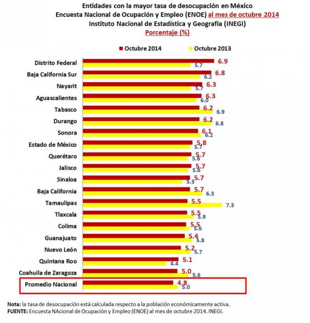 19 entidades que registran tasas superiores al promedio nacional.http://leonardoengd.blogspot.mx/2014/11/entidades-con-mayor-desocupacion-en.htmlLos