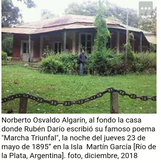 Félix Rubén García Sarmiento conocido internacionalmente como Rubén Darío, (1867-1916), fue un poeta que le dio y aún le sigue dando excelso brillo a la poesía de la lengua española, sus aportes literarios son nobles e indelebles, es lamentable que en los colegios y universidades de Hispanoamérica no se lea continuamente la obra de este magnífico bardo. Norberto, explica que en su país la lectura de Darío es descolorida; “en mi país la lectura de Darío en las escuelas es prácticamente nula. En mi caso nunca lo leí en el colegio. Llegué a él por mi cuenta. Y es una verdadera pena que sea así ya que es bien sabido el amor que él profesaba por nuestro país, por ser, entre otras cosas, la cuna de su libro fundamental Prosas Profanas, y por haber vivido cerca de tres años aquí y haber hecho gran cantidad de amigos literatos”. Osvaldo, le sugiere a los docentes que “siembren en nuestros jóvenes el amor por la lectura de uno de los poetas más originales que alumbró nuestro continente, y a los jóvenes que lo descubran y una vez descubierta esa luz mágica que irradia su poesía, que la difundan y la mantengan viva con el correr del tiempo…”.Darío y muchos otros personajes célebres de la historia nunca tuvieron una educación académica formal, siendo destacados autodidactas lograron a saborear múltiples éxitos, con este derroche de tecnología que hoy disfrutamos, tenemos incontables probabilidades de enriquecernos en conocimientos, ¡que triste el que desperdicia las atractivas caricias que el Internet nos ofrece!... Sobre sus estudios expresa; “Mis estudios son, en cuanto a la literatura, más que nada de autodidacta, y tengo por suerte terminados mis estudios secundarios. Elegí no hacer carrera universitaria al considerar inaceptable el hecho de que te quieran imponer los temas a estudiar. A lo mejor ese fue un gesto de rebeldía de mi parte, y por ende me siento en la “obligación” de ganarme la vida como albañil, oficio que me enseñó mi padre, que es con quien trabajo”. Libros publicados y proyectos literariosSu primer poemario publicado es Juvencia, (2014), en el que plasma, quizás de forma un poco rústica viéndolo a la distancia, sus primeras y más arraigadas influencias. En el 2015 publicó Canciones para Erato, el año pasado publicó Evohe, (2018), este ejemplar sigue la misma tónica que los dos anteriores, sobre el nombre de este último libro Osvaldo cuenta; “lo tomé del mito de Dionisio, el dios del vino y el jolgorio, y era el grito que las bacantes, sus seguidoras, gritaban para invocarlo. Este último libro esta dedicado a una persona a quien yo quise mucho, una persona humilde pero dotado de una gran cultura, Don Antonio Manukian, ya fallecido hace dos años”. Se encuentra trabajando en su 4to libro, este libro nuevo es mucho más reflexivo que los anteriores tres, a los cuales él le llama “trilogía veinteañera”.La “Marcha triunfal” es uno de los poemas más célebres de Rubén Darío, esta encantadora composición fue escrita “la noche del jueves 23 de mayo de 1895” en la Isla Martín García [Río de la Plata, Argentina], (según Pedro Luis Barcia). Norberto, se considera fielmente admirador del “príncipe de las letras castellanas”, en víspera de Navidad del 2018 estuvo en la casa donde Darío escribió Marcha Triunfal, sobre esa mágica visita describe; “fui especialmente porque sabía que Rubén Darío había estado allí y siempre quise experimentar esa sensación de pisar el mismo suelo que él, respirar el mismo aire. O sea, ese viaje fue más que nada de ‘peregrinación’, para hollar el mismo suelo que mi admiradísimo poeta, le escribí mi ‘Soneto’, homenaje”. Confiesa que su máximo anhelo es conocer Nicaragua especialmente donde nació y creció el “Padre del Modernismo”, gracias a la lectura Dariana él descubrió su noble vocación de escribir.Homenaje (soneto)Por esta isla verde y frondosa pasó un día el príncipe lozano que orlara nuestro idioma con el barroco cisne y la onírica paloma y cosas otoñales de azul versallería. Versó con Pan de musas y de filosofía brindando con el néctar, allí, de Grecia y Roma, en una copa helena brillante y policroma y oyendo de las aves agreste sinfonía. Amó la fronda espesa y el canto rebosante de esta isla de ensueño de perla y col diamante, fugaz reminiscencia del griego Mytilene. Si vuelvo tras tus pasos, Rubén, y tras tu acento, ¡las cañas de tu flauta armoniosamente suene la voz inconmovible e indócil de este viento!.Información• https://m.facebook.com/profile.php?id=100005367782076carlosjavierjarquin2690@yahoo.es Escritor y poeta
