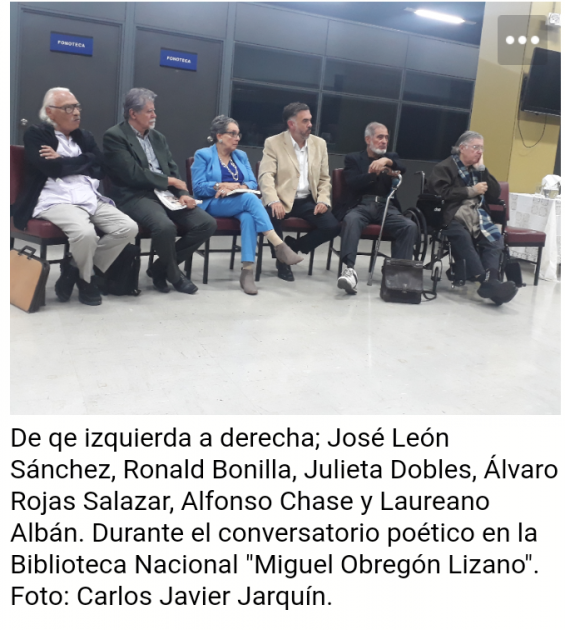 El Ministerio de Cultura y Juventud, Biblioteca Nacional y Colegio de Costa Rica tuvieron el agrado de presentarles el conversatorio poético e histórico con 5 poetas que han sido galardonados con el Premio Magón. Los poetas invitados fueron: Julieta Dobles (n. 1943) Premio Nacional de Cultura Magón 2013. Ronald Bonilla (n. 1951) Magón 2015. Laureano Albán (n.1942) Magón 2006. Alfonso Chase (n. 1944) Magón 1999. José León Sánchez (n. 1929) Magón 2017. El Moderador fue el escritor Álvaro Rojas Salazar¿Cuál era el objetivo principal de esta actividad?El objetivo principal era que el público literato conociera parte de la trayectoria literaria de estos 5 máximos representantes de la actual poesía costarricense, el escritor Álvaro Rojas mencionó que seguirán realizando más actividades de este nivel. Cada uno de ellos narró brevemente parte de su mundo poético especialmente sus inicios, la historia más impactante es la del maestro José León Sánchez; el aprendió a leer en la cárcel y estuvo encarcelado por 30 años.Sánchez enfatizó; “hoy lo que está viviendo la literatura costarricense es trágico, en la Feria internacional del libro invitan muy poco a los escritores nacionales, pero gastan millones de millones de pesos para traer a un escritor extranjero”. En la mayoría de nuestros países hispanoamericanos se repite esa leal realidad de preferir al extranjero e ignorar al nacional, necesitamos ser patrióticos de corazón, necesitamos apoyar constantemente a nuestros artistas nacionales.Los libros de José León Sánchez “han sido traducidos al inglés, italiano, ruso, alemán, holandés, francés y mandarín. Es el escritor costarricense más leído y conocido en el mundo. Del best seller ‘La isla de los hombres solos’ ha vendido más de tres millones de ejemplares y de su obra maestra ‘Tenochtitlán’ varios millones de ejemplares. Ha ganado cinco veces el Premio Nacional de Literatura y fue nombrado Doctor Honoris Causa en la Universidad Nacional Autónoma de México (UNAM). Fue nombrado miembro de la Comisión Mundial de Tratamiento del Delincuente de las Naciones Unidas y ha viajado por 64 países que aún no han abolido la pena de muerte”.Alfonso Chase es un poeta que aprendió a leer desde muy niño, habla inglés y francés, en sus inicios leyó mucho a los poetas costarricense, es un autodidacta que ha hecho historia indeleble. Julieta Dobles dijo que quizás su amor a la poesía nació gracias a su mamá ella le inculcó el hábito de la lectura y también escribía pero nunca publicó libros, una tía de ella constantemente le regalaba libros.El poeta Laureano Albán junto al bardo Jorge Debravo (1938-1967) fundó el Círculo de Poetas de Turrialba. “Ya en los años sesenta, siempre junto a su amigo Debravo, creará en San José el Círculo de Poetas Costarricenses, que vendría a influir en la literatura de esa época y en las generaciones posteriores”. Durante la actividad el poeta Ronald Bonilla mencionó; “Yo creo que si hay mucho talento también hay mucha cosa mala que se consume, para los años 70’ las editoriales estatales publicaban como 10 libros al año con tiraje de 2,000 ejemplares, hoy lo mucho que se publica son 500 ejemplares…”. Laura Rodríguez Amador directora de la Biblioteca Nacional dijo: “Me pareció una excelente noche para la historia para el análisis y una de las poquísimas ocasiones que estaba reunidos cinco premios Magón. Estas actividades con estos maestros enriquecen el conocimiento del público, es maravilloso poder conocer parte de la trayectoria de ellos”. La doctora Irene Quesada estuvo presente y ella dijo; “La actividad me gusto mucho no así la actitud de don José León por suerte el moderador y sus compañeros supieron enderezar el rumbo y no permitieron el boicot, creo que don José puede tener razón en sus quejas pero hay lugares y momentos para realizarlas e incluso hacer un foro para discutir estos temas”, cuando a José, le correspondió su turno de hablar, habló sobre otro tema que no tenía nada que ver con el tema central de la actividad, Irene sugiere “deberían hacerse más actividades de este tipo incluso lecturas de cuentos poemas o novelas con los autores”. carlosjavierjarquin2690@yahoo.es Escritor y poeta