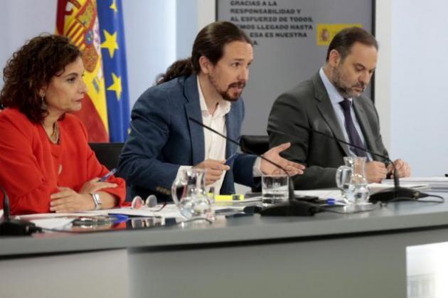 Gobierno de España en una rueda de prensa acompañado por tres ministros,