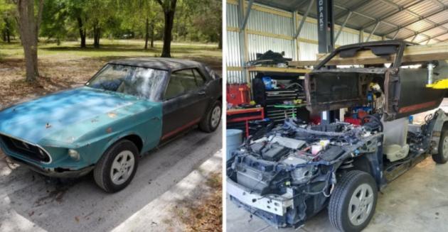 Ahora, alguien llamado David Phinney, ha llevado el concepto a un nuevo nivel soldando una carrocería Ford Mustang 1969 en el tren de rodaje sin marco de un Toyota Prius.