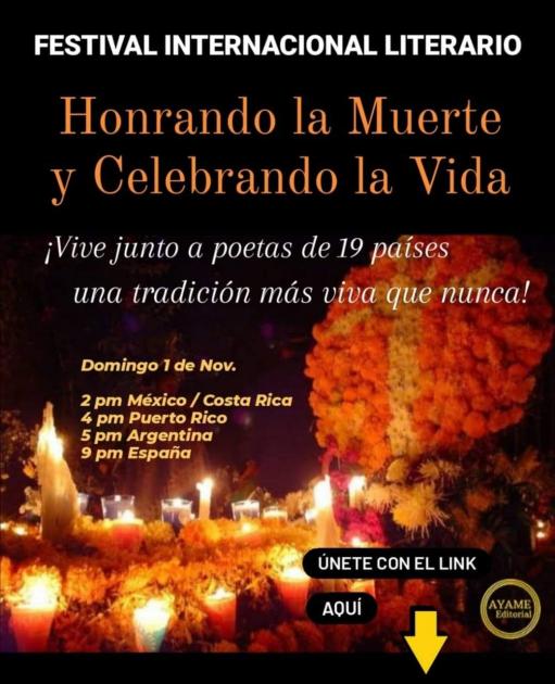 Desde que inició este año 2020, todos los habitantes del planeta hemos tenido que enfrentar la letal e inesperada llegada del Covid-19, un virus que ha causado devastación, tristeza y muerte. A pesar de esto, los seres humanos tenemos la capacidad de adaptarnos y sobreponernos a cualquier circunstancia por más adversa que sea. La historia nos ha demostrado que la humanidad tiene un poder de resiliencia que la ha llevado a crear los mejores inventos y curas.Es importante que en este momento, más que nunca, los seres humanos podamos unirnos y en armonía celebrar la vida. Y qué mejor forma de celebrarla que siendo solidarios o compartir todo lo que está a nuestro alcance con los demás sin importar idiomas, color de piel, religión, ideología política, etc. Cada país goza de diversa e infinita riqueza, pero es triste que los políticos se hayan encargado de dividirnos. Por eso, es en el arte y a través de los artistas que podemos rescatar lo que nos une. Los líderes, los artistas, los intelectuales y los grandes emprendedores deben tomar acción y propiciar un ambiente de unidad en este siglo en que la Internet es parte importante de nuestras vidas porque es capaz de suscitar cambios positivos y ser inspiración.Por esta razón, este próximo primero de noviembre a las 2:pm México/Costa Rica, 9:pm España, se inaugurará el Primer festival internacional literario: Honrando la muerte y celebrando la vida. Este proyecto ha nacido gracias a la iniciativa de dos visionarios: Ana Ayala (México), escritora, poeta, editora y promotora cultural y Carlos Javier Jarquín (Nicaragua), escritor, poeta y gestor cultural. Este proyecto es una mirada a lo esencial, es una sonrisa cálida al idioma universal: el ARTE. Esta iniciativa ha sido diseñada con mucho aprecio y amor para todos los que creen fielmente y con dignidad en el valioso aporte que los escritores, cantantes y poetas podemos brindarle al mundo a través de lo que hacemos. Si te identificas con esta filosofía, eres bienvenido a celebrar la vida con elevada y firme exaltación. ¡Quiénes mejor que los poetas para reflexionar e instar a vivir con entusiasmo y pasión la vida a través de la poesía! En este vídeo podrá ver el nombre y foto de todos los poetas invitados: https://youtu.be/6hswXKbu1Ao Comparto el mensaje de Ana Ayala sobre este festival.Este festival es un evento de características especiales ante la situación global que atravesamos en el 2020 y la necesidad de abrir nuevos caminos o alternativas dinámicas y participativas. Tiene una visión y misión muy definida, que resumimos en los siguientes dos objetivos:1.Utilizar las letras como puente para trascender fronteras y unir participantes de diferentes países y costumbres, con el fin de crear una conciencia multicultural que nos fortalezca y poder enfrentar el reto que presupone hacer un cambio total de paradigmas; sin olvidar que, si bien, el dolor, el temor y la tristeza son emociones inherentes a la vida y denominadores comunes de los últimos tiempos; también lo son la alegría y el privilegio de volver a despertar cada mañana.2. Promover, difundir y compartir con el mundo una festividad declarada por la Unesco como “Patrimonio Cultural Inmaterial de la Humanidad”: el tradicional “Día de Muertos” del pueblo mexicano. Esta peculiar celebración usa diversas expresiones simbólicas para rendir culto, aceptar y honrar la muerte, mientras agradece, enaltece y celebra la vida. Este festejo fusiona la dualidad de existir. Para ello, se elaboran “calaveras” de diversos materiales con el nombre de un ser querido impreso en ellas. La creatividad juega un papel muy importante, en especial la creatividad literaria, pues se escriben versos personalizados, generalmente octosílabos y en rima, llamados “calaveritas”, a manera de epitafio humorístico, y se interactúa y bromea, como recordatorio del destino final que nos espera a todos.Es importante mencionar que existe la creencia, de que durante esos días el alma de los seres amados puede volver para convivir con los suyos; por lo que se elaboran, en su honor, altares con un gran número de elementos significativos para recordarlos. Es una tradición prehispánica y de sincretismo religioso que forma parte importante de una arraigada idiosincrasia que define la identidad y riqueza cultural del pueblo mexicano, que a su vez desea compartirla con el mundo.Para más información visita la página de Facebook: Festival Internacional Literario: Honrando la Muerte y Celebrando la Vida.