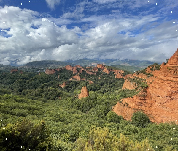A eso de medio día, siempre esperanzado en que la nube dejara de castigarnos, me desvié hacia el mirador de Orellán. Albricias, había dejado de llover, lucía el sol como nunca y no hay mayor recompensa, llegados a este punto, que poder contemplar este sorprendente paisaje que ha merecido la consideración de Patrimonio de la Humanidad por la Unesco. El investigador Javier Sánchez Palencia, en un artículo publicado en la prestigiosa revista Antiquity, sobre la extracción de oro en época romana en la cuenca del Tajo, -que afecta al sur de Salamanca, Extremadura y Portugal-, ratifica la importancia que tuvieron las Médulas para los romanos. Fueron las más grandes, aunque no las más rentables, siempre mirado lo de la rentabilidad desde nuestro criterio actual. Lo que es evidente, porque lo apuntan los investigadores y lo percibes desde aquel privilegiado mirador de Orellán, es que fue una explotación importante y es una de las que mejor se ha conservado. La mayor parte de fotografías que aparecen en revistas y medios de comunicación se han tomado desde aquel punto. Sorprende el trabajo realizado, ahora denominado “ruina montium”, que consistía en hacer pozos y galerías sin salida exterior. Mediante una extensa red de canales se conducía el agua que, al caer con fuerza iba derrumbando las montañas quedando entre el barro las preciadas pepitas.A mi, particularmente, lo de la niebla y la lluvia me vino bien para comunicarle a la guía que iba a aplazar para otra ocasión más propicia la búsqueda de oro. Además, me esperaba la Décima Gémina en Astorga.