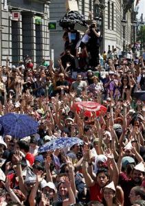 "Nos quedamos por lo menos una semana más", dijo Josu Rebollo, del comité de comunicaciónOtro joven, preguntado sobre cuánto deberían durar las protestas, que han congregado de manera pacífica a miles de personas en numerosas ciudades españolas, respondía en TVE: "Ya que estamos aquí no nos vamos a rendir".El llamado "movimiento 15-M", de "los indignados" o "Spanish revolution", que se ha aglutinado a través de Internet y ha atraído una gran atención internacional, ha surgido en un país que sigue sufriendo las consecuencias de la crisis económica, con el índice de desempleo más elevado de la Unión Europea - uno de cada cinco trabajadores está en paro, una cifra que llega al 45 por ciento entre los jóvenes.De momento, ha propuesto extender a los barrios de Madrid, celebrando asambleas el próximo sábado, y se celebrará otra más en Sol el domingo. Para la tarde hay convocada otra reunión para concretar los detalles de la permanencia otra semana en el centro neurálgico de la capital de España de una acampada cada vez más extensa.Está por ver la influencia que tendrá esta protesta en las urnas, si habrá una mayor abstención o apoyo a los partidos minoritarios, y cuál será el grado de apoyo popular a partir del lunes. Varios medios han recogido el descontento de muchos comerciantes de la zona centro de Madrid por el descenso de las ventas en este punto decisivo para el turismo.El movimiento ya desafió la prohibición del organismo electoral de mantener las concentraciones en la jornada electoral, víspera de los comicios, y el Gobierno optó por no disolverlas debido a su carácter pacífico y después de que retiraran los lemas políticos de las plazas.La protesta de Sol, en la que duermen centenares de personas durante las noches y que supera las 20.000 durante las tardes, se ha convertido en un campamento con un elevado nivel de organización, con comités que se ocupan de atender a los medios de comunicación, repartir comida y bebida que les llega de numerosas donaciones, de la limpieza e incluso del "respeto", con carteles que recuerdan que "la revolución no es un botellón" y pidiendo no consumir bebidas alcohólicas."Sabíamos que algo así acabaría pasando. La política española no ha sido muy convincente, y con todas las consecuencias de la crisis, algo tenía que pasar", dijo el sociólogo Fermín Bouza, de la Universidad Complutense de Madrid."En conjunto es más un aviso de algo que puede estar empezando y no sabemos cuánto recorrido va a tener", manifestó José Juan Toharia, presidente de la encuestadora Metroscopia.Un cartel en el que puede leerse "People of Europe, rise up" (Gente de Europa, levantaos) cuelga en uno de los laterales publicitarios de la plaza, junto a otro con la fotografía del líder nazi Heinrich Himmler con unas orejas de Mickey Mouse y el lema: "No nos representan".Además, Turistas y curiosos toman fotografías de los centenares de mensajes cuelgan de cabinas telefónicas, kioscos e incluso de la cúpula acristalada de la nueva boca del metro situada en el centro de la plaza, pidiendo "más pan y menos chorizos", o "ahora que hemos conquistado el Sol, queremos conquistar la luna".Las elecciones del domingo renuevan los ayuntamientos del todo el país y 13 de los 17 gobiernos autonómicos, así como Ceuta y Melilla. Según los sondeos, el PP podría arrebatarle algunos de sus feudos autonómicos más importantes al PSOE, perjudicado por las medidas de austeridad que ha aplicado para luchar contra el elevado déficit público.