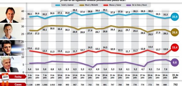 Las encuestas falaces en casos, hablan de polarización, también de que el electorado prefiere a tres candidatos: Scioli, Macri y Massa.