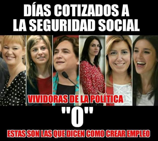 Precisamente para evitar llamar a ese tipo de gente cosas muy raras, nos vamos a centrar en seis personajes (así, no ‘personajas’, como diría, por ejemplo, Alberto Garzón y otros del clan de personajes de colmillo retorcido) que han aparecido integrados en una fotocomposición; a saber, Leyre Pajín, Bibiana Aído, Ada Colau, Rita Maestre, Susana Díaz e Irene Montero. En la citada foto se dice que ninguna de ellas ha trabajado fuera de la política, al menos antes de llegar a ese noble arte; otra cuestión es cuando se dan a conocer. Por lo tanto nunca antes habían cotizado a la Seguridad Social; es más, se remata la simpática foto con el comentario: “¿Éstas son las que dicen cómo crear empleo?”.