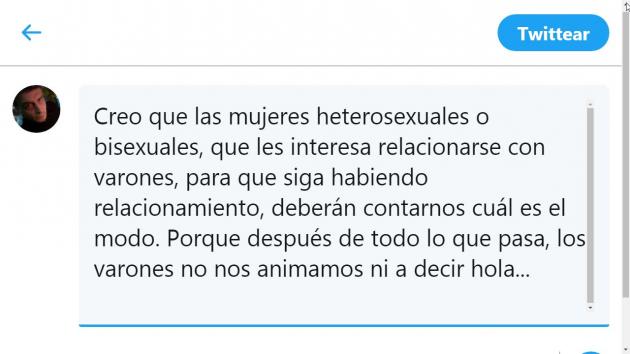 El último fin de semana un tweets que publiqué (con el que ilustré la nota) tuvo ciento de reacciones y respuestas desde positivas, negativas a interrogantes compartidos. Sin citarlo textual, el concepto que compartí más como interrogante que como certeza, fue: "Que si las mujeres hetero y bisexuales, quieren seguir relacionándose con varones, deberán establecer cuáles serían los nuevos modos...porque con lo que pasa, los varones no se animan a decir ni hola.."