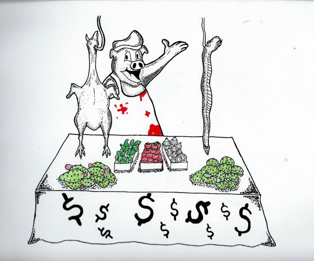 Esos cerdos que con las ropas y el cuerpo manchados de sangre, de nuestros propios hermanos, siguen ofreciendo a quien pasa frente a ellos, los jirones que aún quedan de nuestra patria, según aparece en el cartón que magistralmente creara especialmente para esta nota mi dilecto amigo Julio Castillo y que aparece al inicio, engalanando el texto. El águila parece pollo, la serpiente cuelga ya exánime y los nopales, ese fruto de la tierra de México, su orgullo, cada día parece más lastimado.