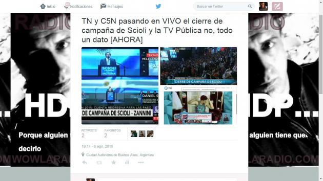 Era impensado para este momento, que al cierre de campaña de Scioli lo transmitiera TN en vivo (Magnetto) C5N en vivo (Cristobal López) y que Canal 7 la Tv Pública, apenas hiciera un avance y siguiera con su programación de ese horario (en la foto que ilustro la nota, está mi twitts con las capturas de pantalla de esa hora)