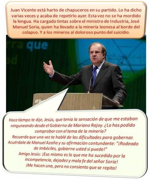 Por Jesús Salamanca Alonso / Juan Vicente Herrera está que trina por las faenas recibidas desde el Gobierno central. Primero por las injusticias cometidas por el estúpido integral del Ministerio de Hacienda, señor Montoro. Después por la falta de apoyo ante los temas de interés para Castilla y León. Posteriormente por la desidia de la vicepresidenta, Sáenz de Santamaría, para acudir allí donde Herrera Campo precisaba apoyo. Y, por si no era suficiente, ha recibido una bofetada desde el Ministerio de Industria: José Manuel Soria –ministro de la cosa– le ha ninguneado y le ha hecho perder tiempo con el proyecto sobre la minería; un proyecto que ni siquiera ha visto la luz, después de muchos meses de marear la perdiz y no darla de comer. Pero hay más cuestiones.