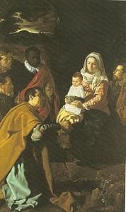 Pertenece a los primeros años sevillanos de Velázquez, donde pinta lienzos de asunto religioso, y donde recoge los principios del naturalismo de Caravaggio, del tenebrismo y del claroscuro. Es también en esta época cuando comienza a pintar retratos, como el de Sor Jerónima de la Fuente (1621). Probablemente comienza en esta Adoración ensayándolo, ya que para dar vida a los protagonistas de la escena, y muy al modo de Caravaggio, utiliza a miembros de su familia. Por ello, se puede distinguir al niño Jesús con su recién nacida hija Francisca; la Virgen podría resultar ser cualquier muchacha sevillana, pero muchos autores han atribuido su rostro al de su mujer; y en cuanto a los Reyes Magos, Melchor podría ser su suegro Pacheco; Gaspar, Velázquez; y Baltasar un sirviente de la casa.