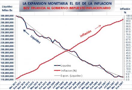 De allí que hemos definido a la inflación como ese proceso sostenido de pérdida de poder adquisitivo del bolívar –poder de compra- que desde luego no es el 30% que el BCV publica, sino que se relaciona másdirectamente con la data que no publica, que hemos comentado en esta nota, pero que se puede observar en la devaluación de la tasa de cambio, mecanismos mediante el cual el gobierno paga su déficit fiscal y que desde luego observamos en el vertiginoso crecimiento de la liquidez monetaria.
